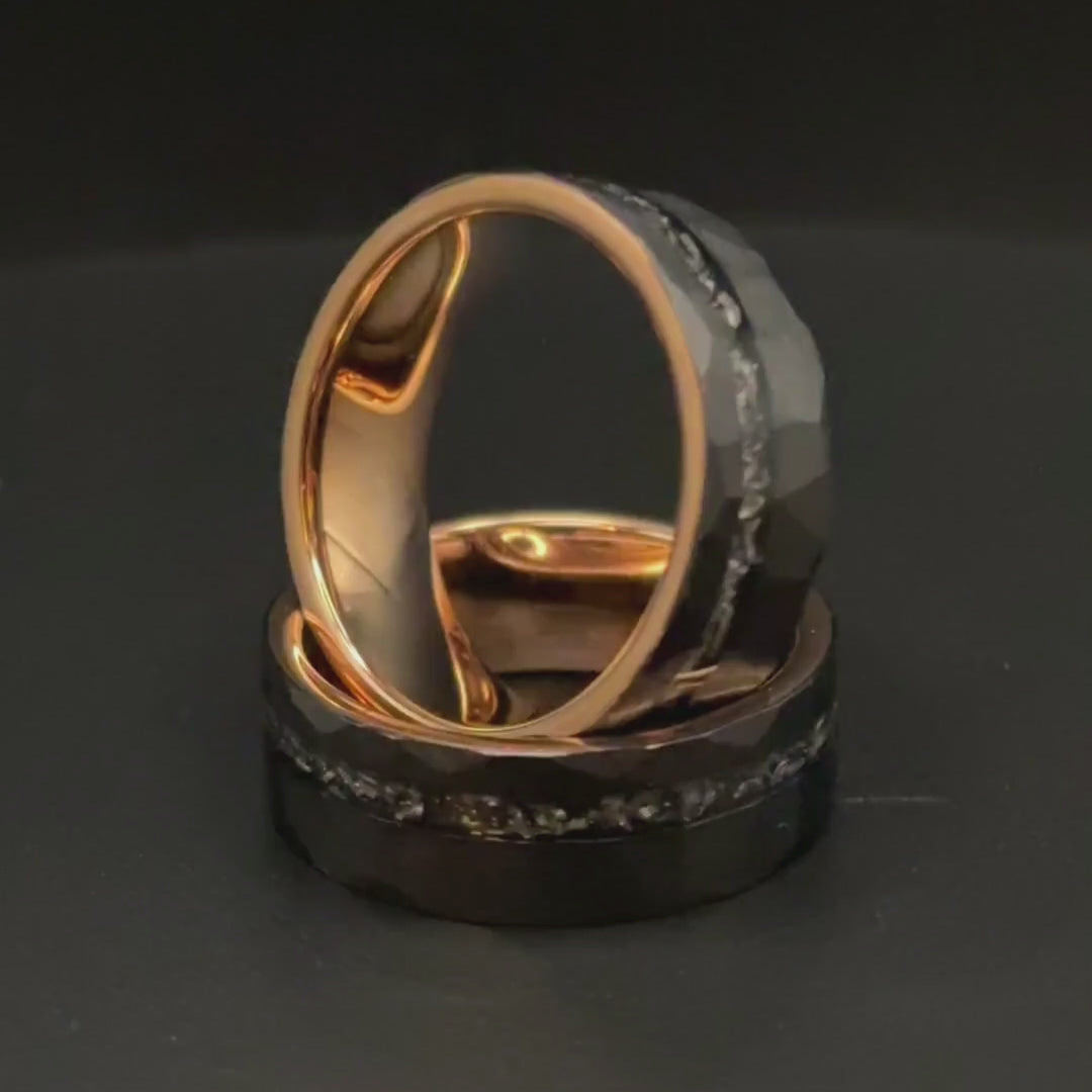 Schwarzer gehämmerter Meteoritenring mit Roségold 8 mm